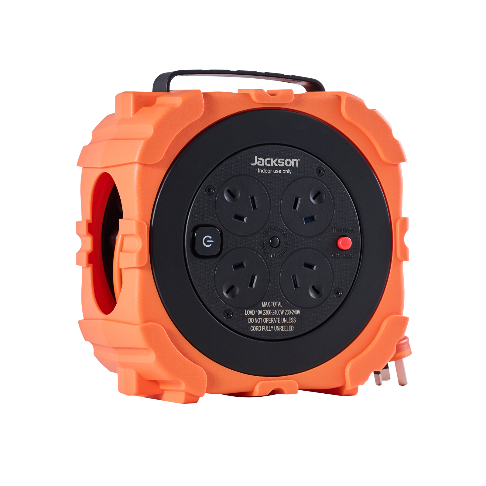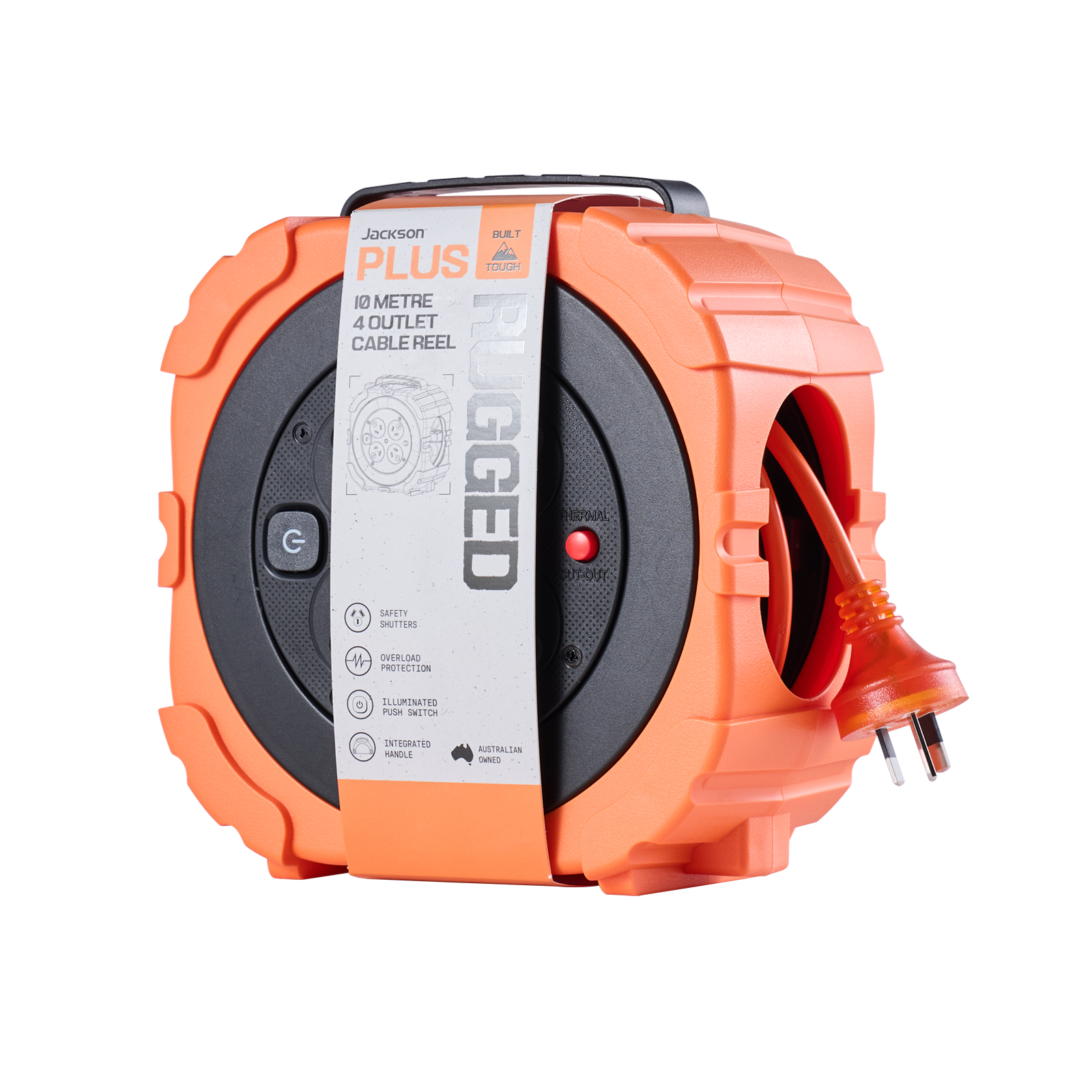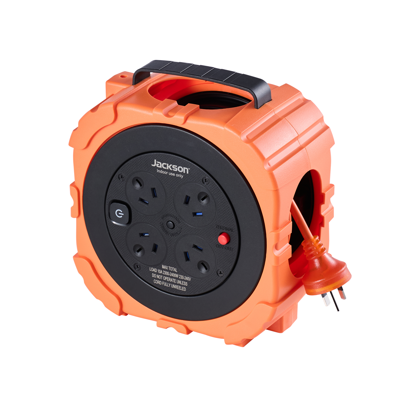 The Jackson Rugged RUGR410OR cable reel is built for portability and reliability, providing power precisely where you need it. Featuring 4 safety-shuttered outlets and a generous Heavy Duty 10-metre cord length, this reel handles multiple devices simultaneously.